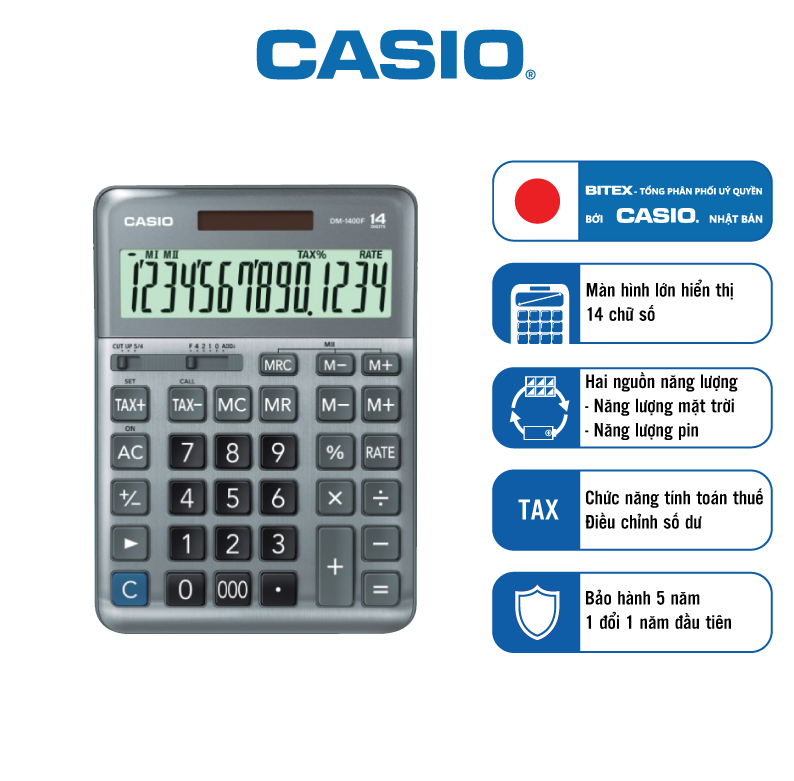 Máy tính Casio DM-1400F là một máy tính bàn đa chức năng đáng tin cậy từ Casio. Với thiết kế hiện đại và màn hình LCD lớn, nó cho phép bạn dễ dàng đọc và theo dõi kết quả tính toán.